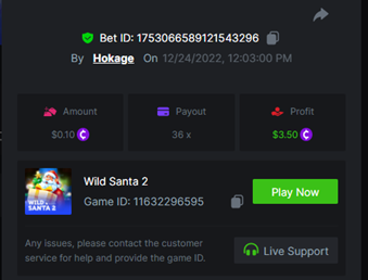 Book of Elves - 278.99x https://bc.game/#/sd/10ZW5ZYES0LGK3 Book of Xmas - 40.00x https://bc.game/#/sd/10ZWB4K9F62Y37 Wild Santa II - 36.00x https://bc.game/#/sd/10ZWBLXSP60MC3 Santa's Wild Night - 12.00x https://bc.game/#/sd/10ZWA1AREBUYVN -