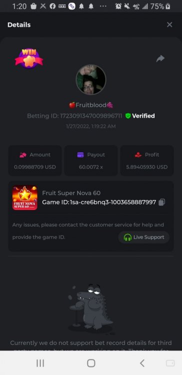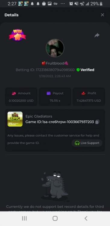 7. I doubt I grind now that the games aren't individual but are combined. Thought I got first for johnny cash last time and nah I'm 6th overall. Sucks that you cant grind a game you enjoy for top prize and ignore others anymore Fruit Super Nova 60: 60.0072x Betting ID:1723091347009896711 Epic Gladiator: 75.115x Betting ID: 1723186180794098560