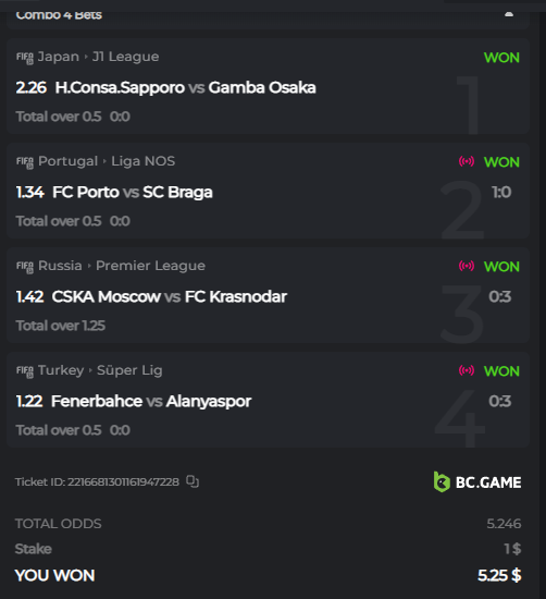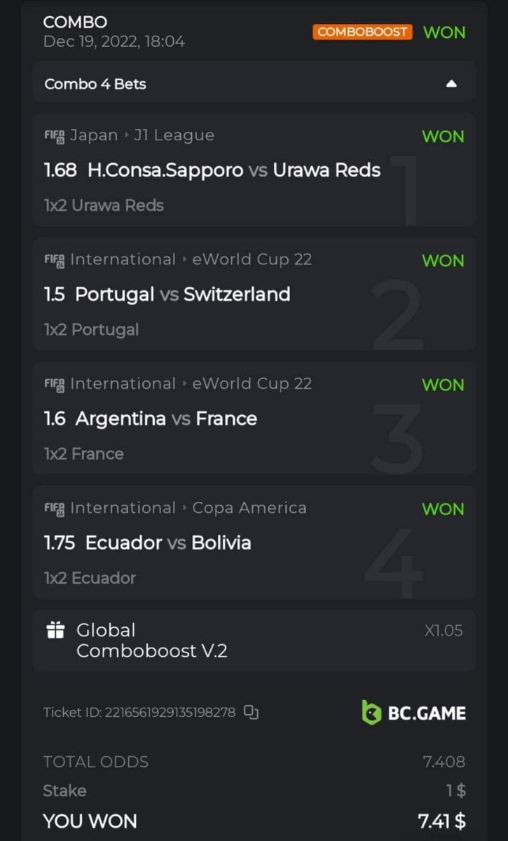 Moderator Mat Posted December 18, 2022 Moderator Share Posted December 18, 2022 $300 BC.GAME SPORTS PARLAYS CHALLENGES #35 Start: 18, Dec 19:00 UTC Ends: 25, Dec 18:59 UTC Hello, ladies and gentleman! Sports Parlay Challenges #35! With a prize pool of $300, the Top 7 takes home a grand prize, and the remaining $60 will be split among all other entrants! What is the challenge? Win a multi-bet with at least x4 by betting on at least 4 matches (all sports) All bet slips must be posted open! Any closed published bet slip will be disregarded! The ODDS for each game will be added up and counted as total points. Voided, half-loss, and half-win bets aren't eligible for the challenge! Cashed-out bets aren’t eligible for the challenge. Using the same odds on a single bet slip isn't allowed Providing the bet link isn’t mandatory Minimum VIP No Minimum VIP Level Minimum payment Multiplier minimum 4x, however, only the top 7 winning parlay multipliers will win the grand prize! Minimum bet size Equivalent to U$$ 1 Eligible currencies All cryptocurrencies are eligible (except JB) Rewards available 1st place.......$100 2nd place.....$60 3rd Place...... $40 4th Place...... $20 5th Place...... $10 6th Place...... $5 7th Place...... $5 The remaining $60 will be split among all other participants who meet the minimum requirements and minimum stake. How to enter: To participate, post your Ticket ID, along with your Parlay link, as a reply to this thread as follows: Link bet: https://bc.game/sports/?bt-path=%2F%3FbtBookingCode%3D561A9D1 + Ticket ID 2126602890796736992 Along with the screenshot of your accumulated ticket. See how to get your sports bet link below! https://imgur.com/a/BRSyxVE Ticket ID 2126602890796736992 If a selection results in a void or push, the bet will remain eligible as long as it remains equal to or greater than a triple bet and meets the odds requirements. Bets withdrawn will not be counted. Please combine all your hits into a SINGLE post. Edit your existing post to get additional hits, don't create a new post. Bets must be placed during the time window specified above. This thread will automatically lock when the time period ends. One (1) entry per family. If someone finds multiple prizes, they will be disqualified from the challenge as well as all future challenges. Failure to follow the instructions will result in the cancellation of your submission. By entering this challenge, you acknowledge that BC.Game has final decision rights over results and placement. 1 Link to comment Share on other sites More sharing options...
