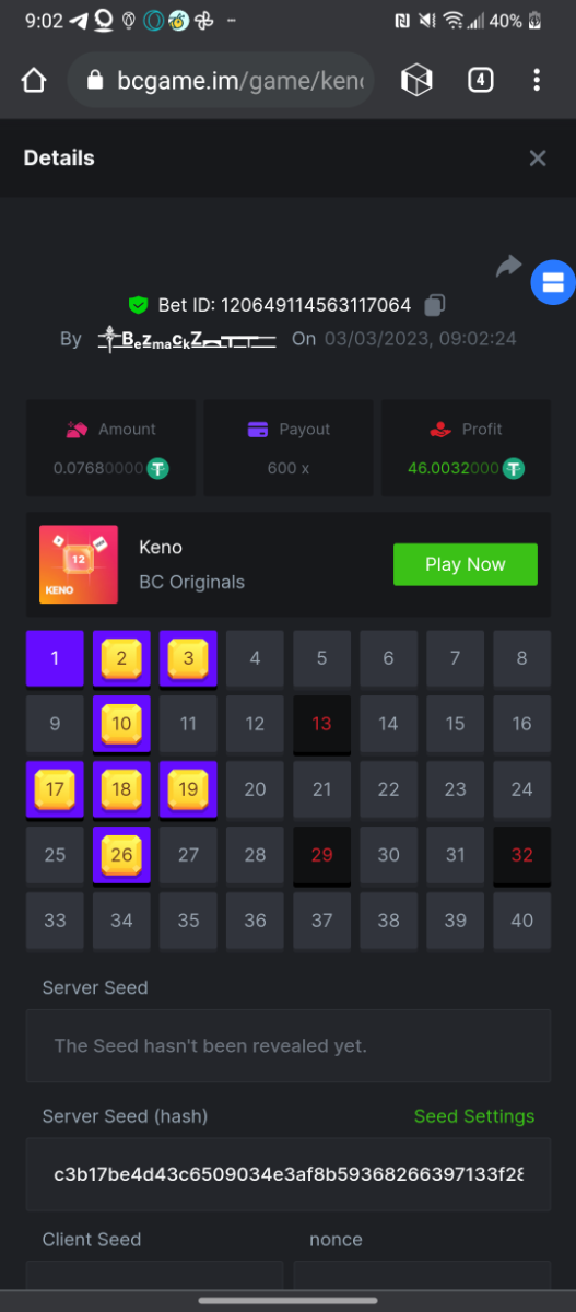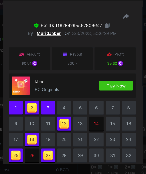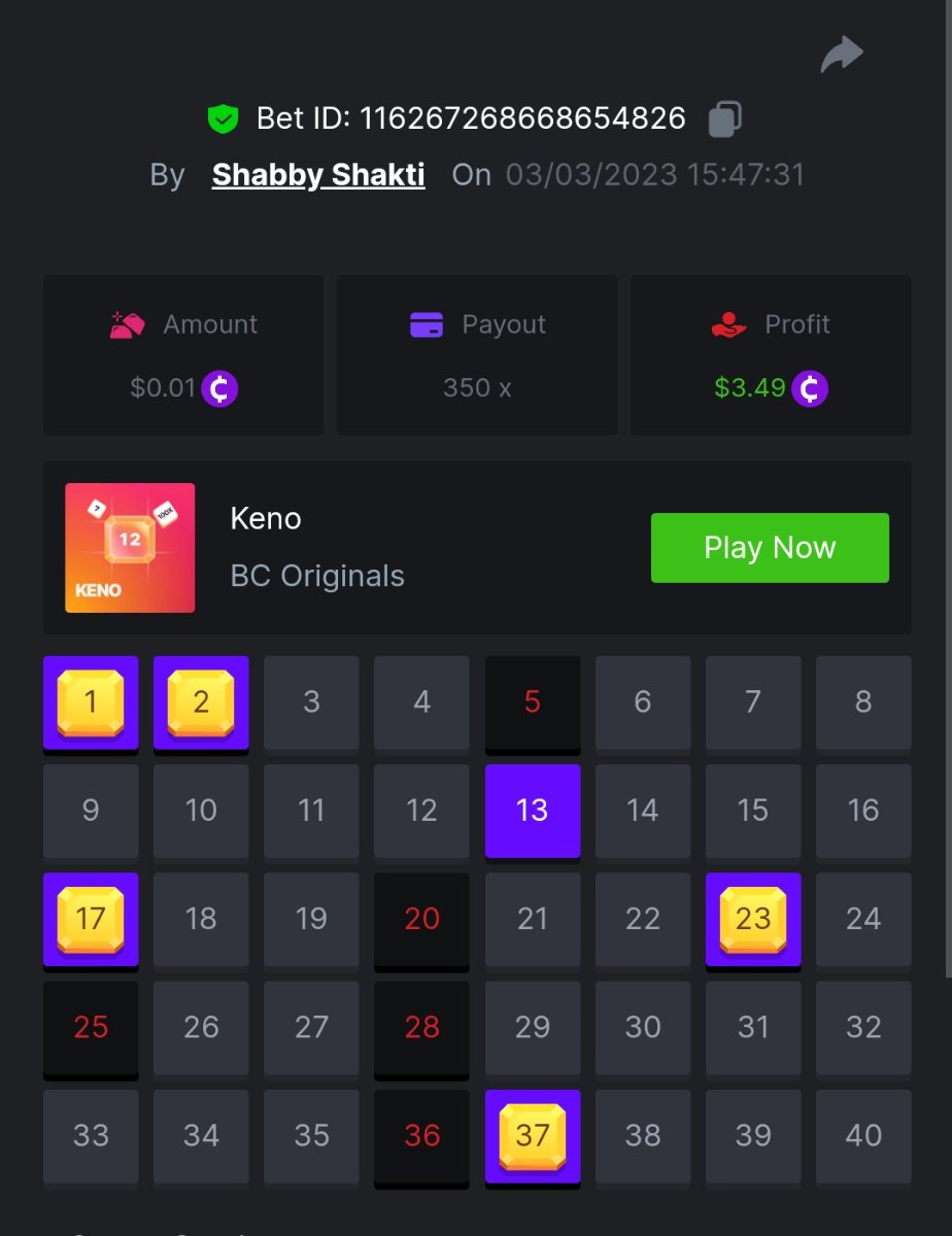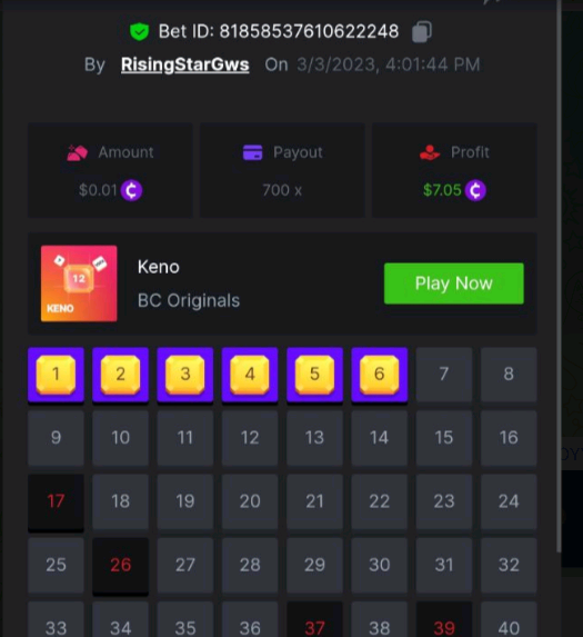 Maksypro Posted March 3, 2023 Share Posted March 3, 2023 ย Read Carefully Before Start To Hunt Daily Challenges #163 ย KENO Hunt : Win the highest pay out Min Payout requirement X100 Min Level 4 ๏ธDuration Starting : Now End time : 23.59 UTC Time How to Join? Make screenshot + paste your bet link + UID or Profile link Mini bet amount - 0.01$ Any coin allowed Reward Prizes 1st Place.....$7 BCD 2nd Place.....$5 BCD 3rd Place.....$4 BCD 4th Place.....$3 BCD 5th Place.....$2 BCD ๐ต Winners will be announcing next day after Roll Point! 4 Link to comment Share on other sites More sharing options...