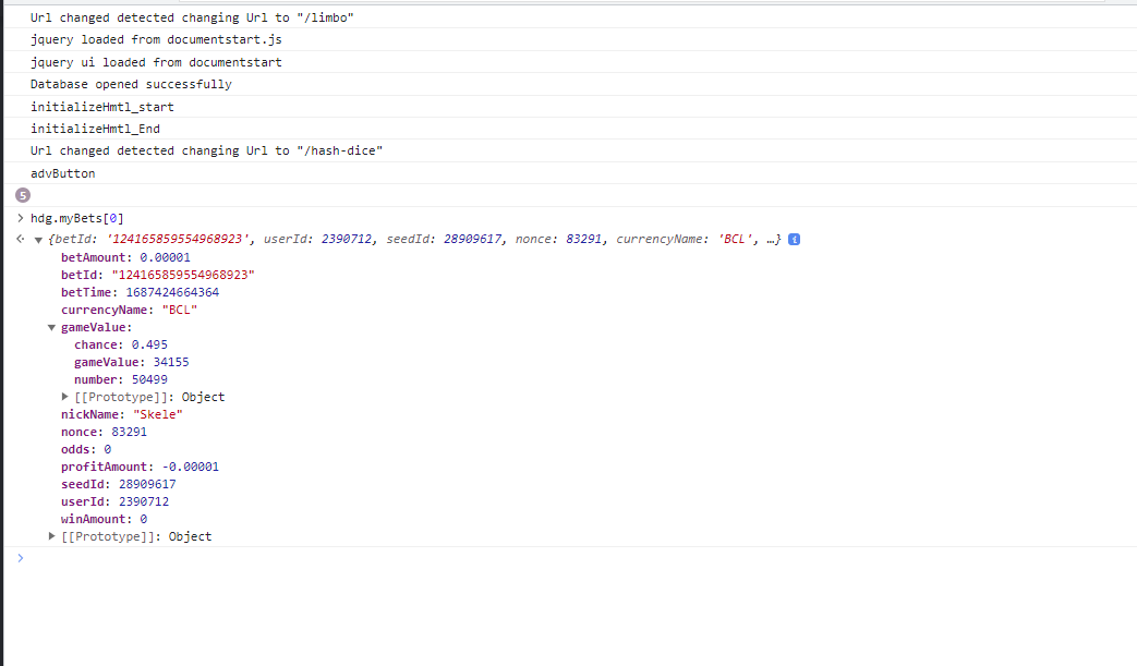 Skele Posted November 28, 2023 Share Posted November 28, 2023 This one like i said works client side not in the sandboxed scripts: log.info('Dernier jeu : ' + hdg.myBets[0].gameValue.gameValue); as in use the dev console. The game object itself does have a history property but it doesn't look like they populate it before handing it to us. but when i ran log.info(JSON.stringify(game)) it came back with the output:{"_events":{},"_eventsCount":0,"history":[],"isHistoryWarning":false} so clientside is the only way you will be able to get it. Link to comment Share on other sites More sharing options...
