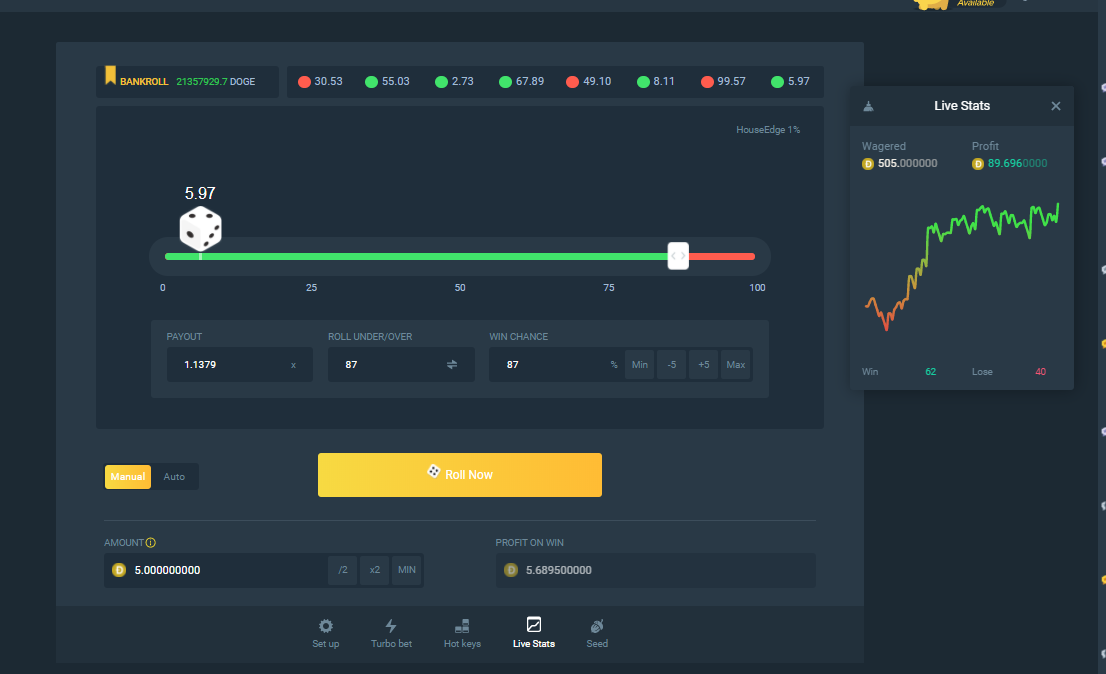 MsJenna-willis Posted August 12, 2020 Share Posted August 12, 2020 Hi guys so this strategy is easy you just need a small fixed bet for me its 5 doge. So here's how you do it you that white thing you drag to adjust the bet, what you are going to do it when the first bet you made goes to which ever number go to opposite by siwtching to the opposite side . [Example] 5.97 was the last number go to 94 don't need to be exact. if it goes to 25 drag it to 75. That's it enjoy playing classic dice. (i had 140 doge at the start now I'm at 246 doge not bad.) Try it and share how well it works for you. Link to comment Share on other sites More sharing options...
