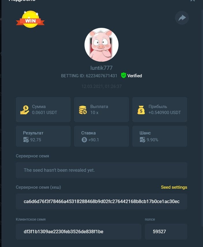 luntik777 Posted March 11, 2021 Share Posted March 11, 2021 ID bet : 6223407671431 6223407671430 6223407671429 6223407671428 I caught 4 in a row Amount : 0.06010000 USDT  the screenshot does not open BC_Panda  I sent screenchot it to you  PM and Telegramm  Link to comment Share on other sites More sharing options...